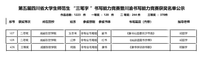 近日,由四川省教育厅主办的2025年(第五届)四川省大学生师范生“三笔字”书写能力竞赛公示了获奖名单。我院尺雪堂书画工作室学子获得二等奖两项,三等奖一项。本次大赛中,由马克思主义学院书法选修课邓振宇老师指导尺雪堂书画工作室4名学生代表成都东软学院参与了毛笔书法赛道的角逐,其中3人获得等级奖,获奖率达75%。