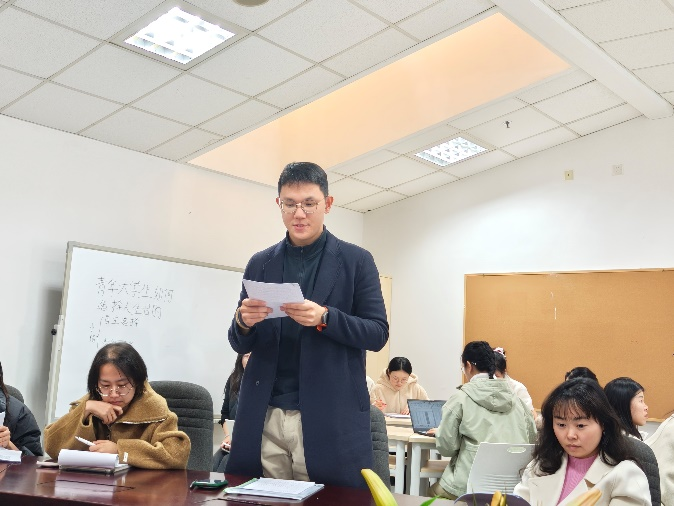 随后,王才蔚和温若阳两位同志依次向大会汇报预备期间的思想、工作、学习情况:王才蔚同志结合马克思主义理论研究与教学实践,分享了在理论学习深度、课堂教学创新等方面的成长与不足,表达了以党员标准严格要求自己、深耕思政教育领域的决心。温若阳同志则围绕政治素养提升、理论学习、思政教学等内容进行汇报,着重阐述了在理论学习、教学工作中的实践感悟,以及对党员责任与使命的深刻认知。