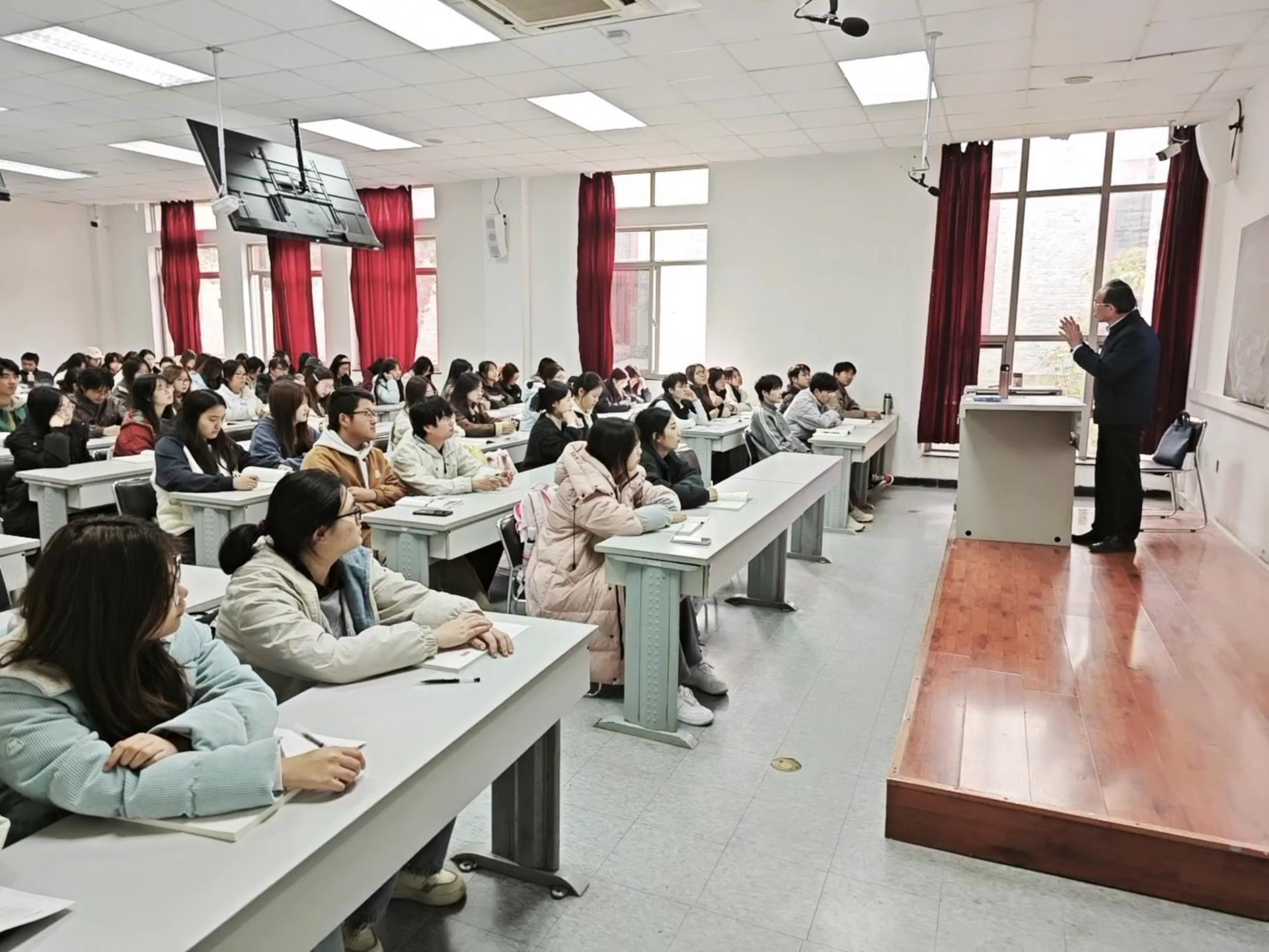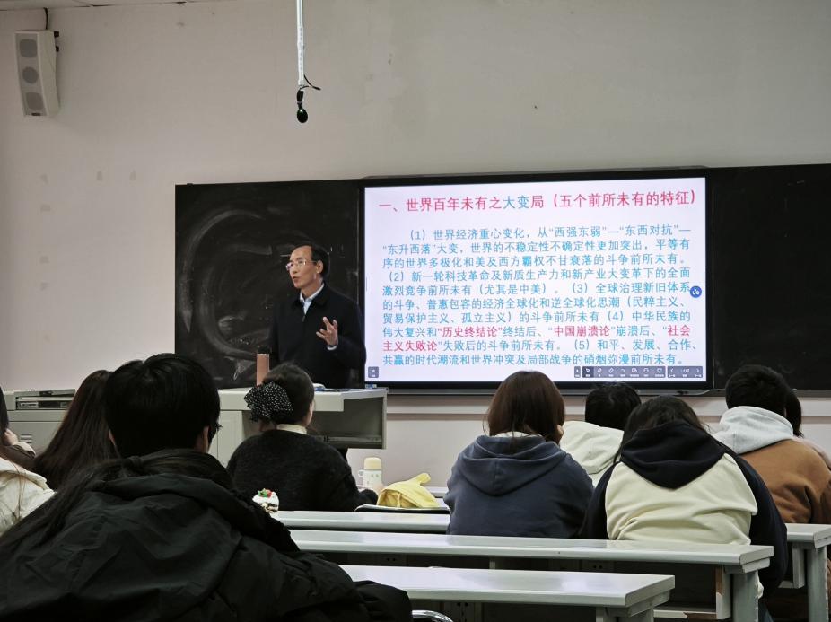 随后,赖廷谦书记以“世界百年未有之大变局与人类命运共同体”为核心展开讲解。他从世界百年未有之大变局的五大特征切入,结合当前变乱交织的国际形势与大国关系演变,用鲜活案例剖析全球格局的深刻变革;同时围绕人类命运共同体理念及全球发展、安全、文明、治理四大倡议,深入解读中国方案对完善全球治理、促进世界共同发展的重要意义,引导学生树立国际视野,增强时代责任感。