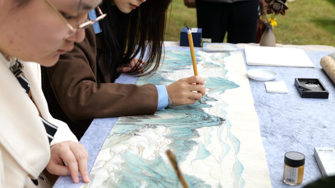 “师生共绘山水画手卷” 环节将整场雅集推向高潮。活动现场,师生们分工协作、默契配合,以张大千先生经典的金碧山水画风格为创作蓝本,聚焦青城山的雄奇景致与都江堰的人文底蕴,挥毫泼墨、勾勒点染。大家笔下的峰峦叠翠、江水蜿蜒,既还原了自然山水的灵秀之美,又融入了对本土文化的深厚情感。此次共创不仅充分展现了师生扎实的艺术素养与创作活力,更以艺术实践响应了都江堰文化遗产推广的号召,进一步深化了校地文化共建的联结,让传统书画艺术在互动中焕发新生机。