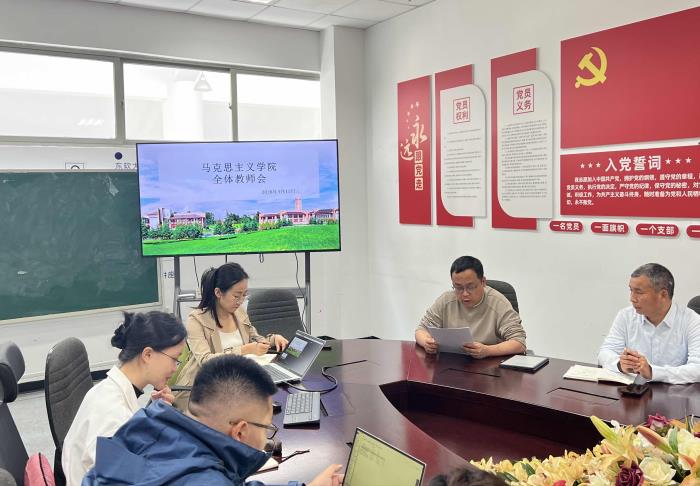 2026年4月15日下午,马克思主义学院在A2-303会议室召开全体教师会,会议由院长欧阳稚文主持,重点部署学院组织结构调整、人员任免、工作分工及近期重点工作,全体教职工参会。